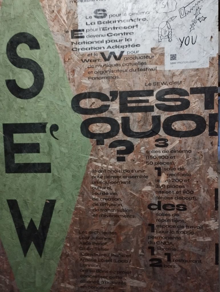 Le Sew est ce qu’on appelle un tiers lieu ou nouveau lieu, eux se définissent plutôt comme un inter-lieu. Il a ouvert en octobre 2021. C’est un regroupement associatif culturel de 5000m2 dédiés à tous les publics créer à partir de trois structure culturelle: le cinéma associatif la Salamandre, le CNCA (centre nationale pour la création adaptée issu de l’histoire du théâtre l’ entresort) et WART association née dans le cadre du festival panorama ( festival de musiques actuelles en 1997) dont le domaine d’activité est arts du spectacle vivant. A ces trois structures culturelles s’ajoutent un bar, un restaurant ( actuellement en cessation d’activité, mais à la recherche d’ un repreneur) , l’annexe de la librairie et des salles en location. sur le site de la manufacture on retrouve également l’espace des sciences. Le nombre de visiteurs en 2023 est de 85 000 à comparer aux 63 000 habitant de la communauté de commune de Morlaix. Son objectif est un rayonnement national.